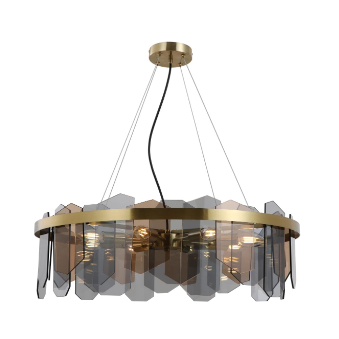 Sterk belysningsfabrikk valgt høye transparens dobbeltfargede glassark brukes, med vekslende kaldt og varmt dobbeltfarge glass for å skape en distinkt lagdeling av lys- og skyggeeffekter. Hovedlampearket har en ravgradientprosess, mens det sekundære lampearket er laget av røykgrå glass, og presenterer en tredimensjonal glorie når den tennes og viser frem teksturkollisjonen av metall og glass når det er av. Pendellens metallramme med dobbeltfarge glassfinish gjennomgår antioksidasjonselektroplaterende behandling, og gjenoppretter fargen på kobberimitasjon og forbedring av holdbarheten. Den 68 cm store sirkulære hoveddelen er sammenkoblet med 8 lampearmer, med hver lampe som er i stand til å bære en maksimal vekt på 10 kg.