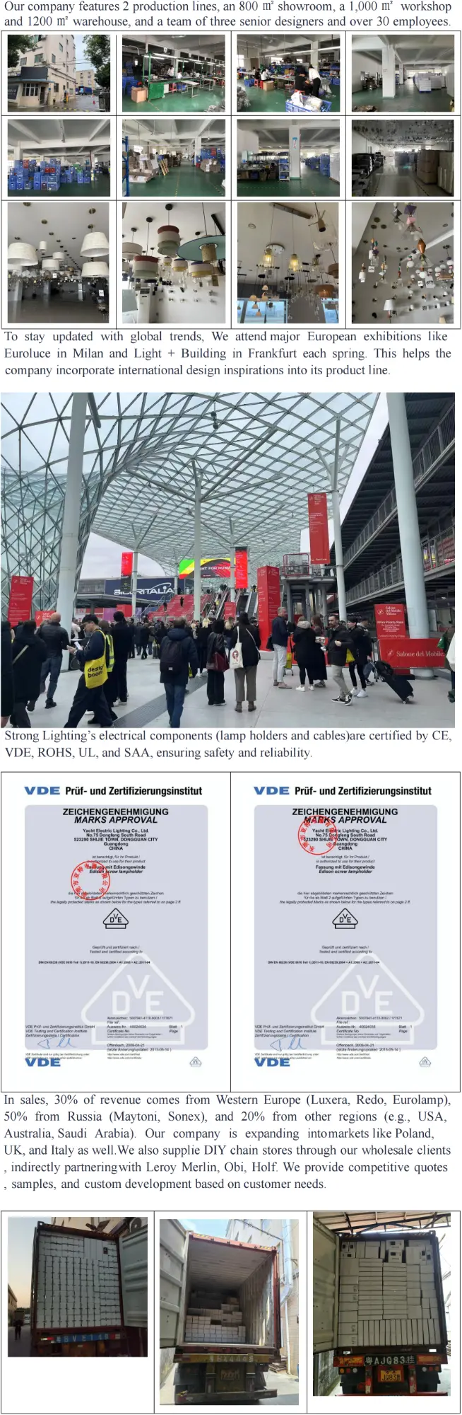 Vi har stolt tjent globale navn som Leroy Merlin og OBI, og bygget opp et rykte for utsøkt design, holdbar kvalitet og levering til rett tid. Siden 2015 har Strong Lighting vært dedikert til å skape belysningsløsninger som reflekterer personlig stil. Vårt 3000+ produktspekter spenner fra klassisk til moderne, og blander materialer som glass, metall og krystall for å lage innovative, funksjonelle deler.