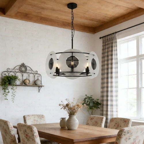 Bygget med en robust mattsvart jernramme, har denne mattsvarte glasslysekronen sirkulære sukkerglassskjermer og bikakemetallnetting, og skaper en slående lagdelt estetikk der lyset diffunderer mykt gjennom det teksturerte glasset mens nettet gir en industriell kant.