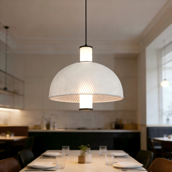 Inspirert av de banebrytende designtrendene på Euroluce-utstillingen i Milan i 2025, blander denne minimalistiske italienske pendellampen i silkenett fra Strong Lighting sømløst italiensk minimalisme med praktisk funksjonalitet. Den sentrale 15W LED-lyskilden sender ut et 4000K nøytralt lys, og skaper en behagelig atmosfære. Med en lysstyrke på 1500LM og en høy fargegjengivelsesindeks på Ra>80, er lyset naturlig og naturtro, noe som gjør det egnet for stuer, spisestuer og andre rom. Den runde bueformede lampeskjermen er laget av jernnett pakket rundt hvitt silkestoff, og den mattsvarte maskinvaren er ferdig med en spraymalingsprosess for å legge til tekstur. Den enkle designen integreres enkelt i nordiske, moderne og andre hjemmestiler.